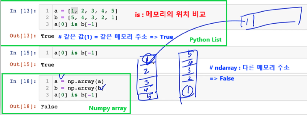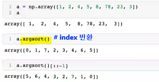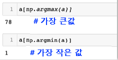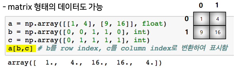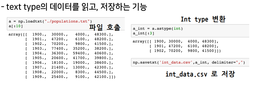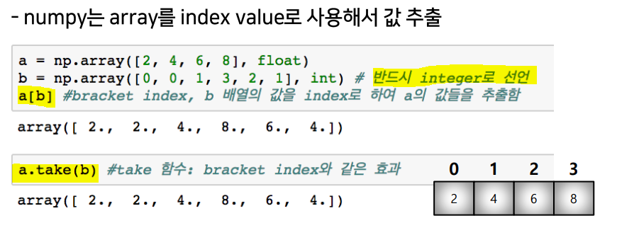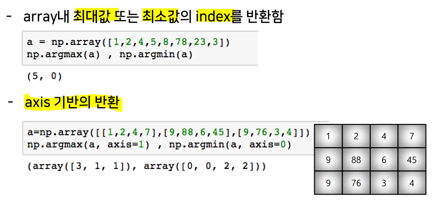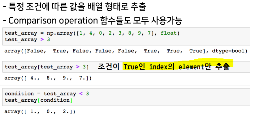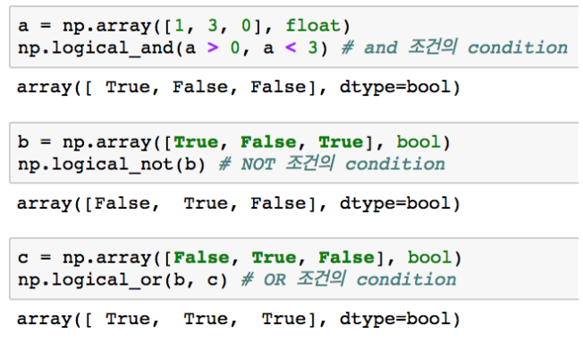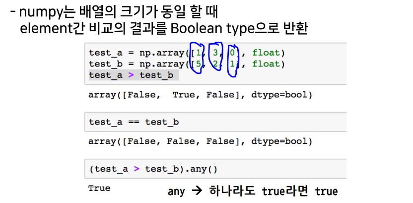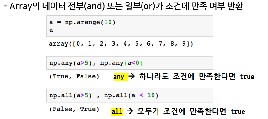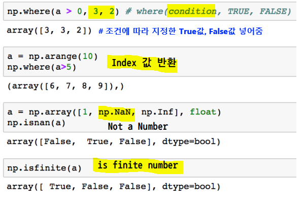 np.all(), np.any : array의 데이터 전부(and) 또는 일부(or)의 조건 만족 여부 반환comparison operation : numpy는 배열의 크기가 동일할 때 element간 비교의 결과를 Boolean type으로 반환한다.np.where(condition, TRUE, FALSE) : 조건에 따라 테스트한 후 결과는 지정값으로 채워진 array로 반환np.where(condition) : Index 값 반환np.isnan(array) : NAN인지 아닌지 테스트한 후 결과는 부울 array로 반환np.isfinite(array) : 유한 요소 (무한이 아니거나 숫자가 아님)에 대해 요소별로 테스트한 후 결과는 부울 array로 반환np.argmax(), np.argmin() : array내 최대값 또는 최소값의 index 반환boolean index -test_array[test_array > 3] : 조건이 True인 index의 element만 추출fancy index - a[b] / a.take(b) / a[b,c] : array를 index value로 사용해서 값 추출(matrix 형태의 데이터도 가능) numpy data i/o