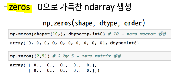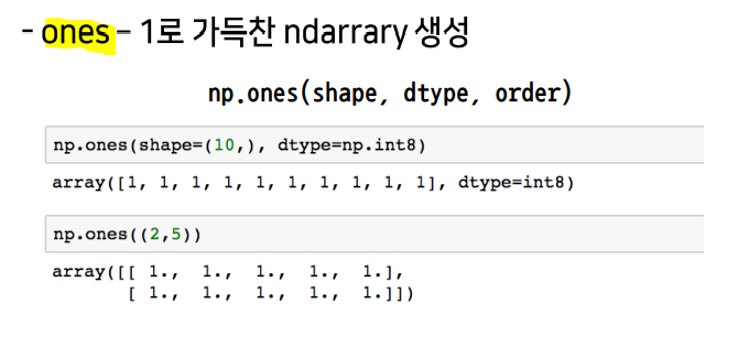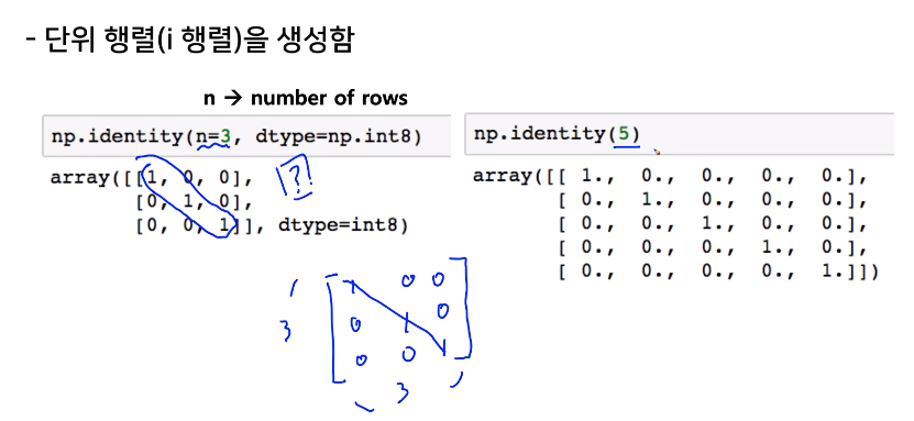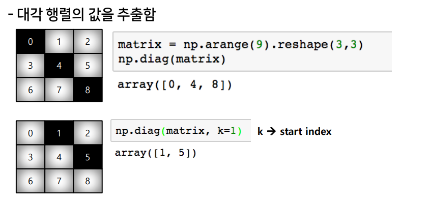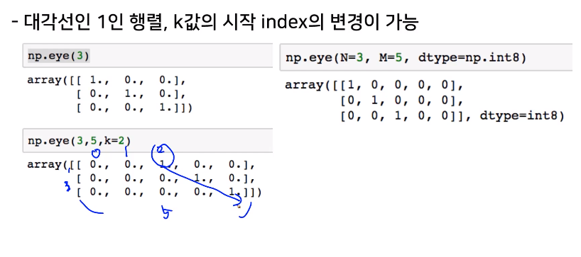 np.arange(start, end, step) : 범위 지정하여 값의 list 생성np.zeros(shape=(), dtype, order) : 0으로 가득찬 ndarray 생성np.ones(shape=(), dtype, order) : 1로 가득찬 ndarray 생성np.empty(shape=(), dtype, order) : shape만 주어지고 비어있는 ndarray 생성np.something_like(array) : 기존 ndarray의 shape 크기 만큼 1, 0 또는 empty array 반환np.identity(n, dtype) : 단위 행렬 생성np.eye(n, m, k, dtype) : 대각선이 1인 행렬, k값=시작 indexnp.diag(matrix, k) : 대각 행렬의 값 추출np.random : 데이터 분포에 따른 sampling으로 array 생성operation function