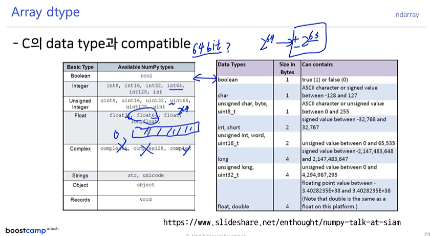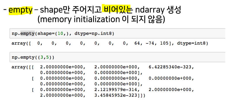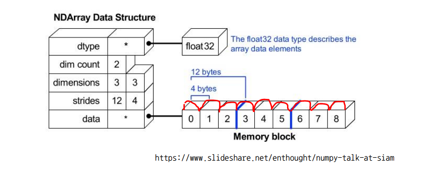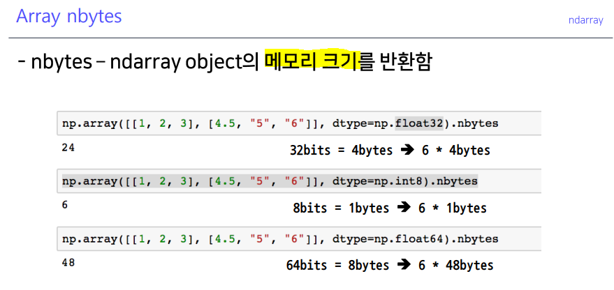 .dtype : data type (이에 따라 memory의 크기가 결정됨).nbytes : 메모리 크기 반환Handling shape