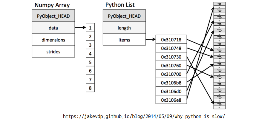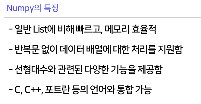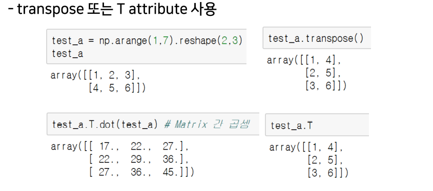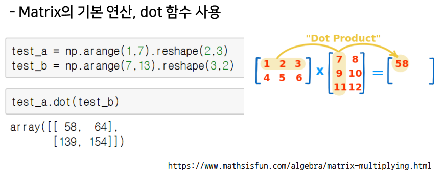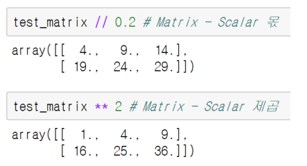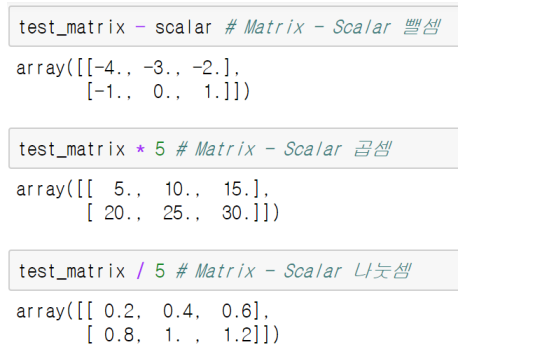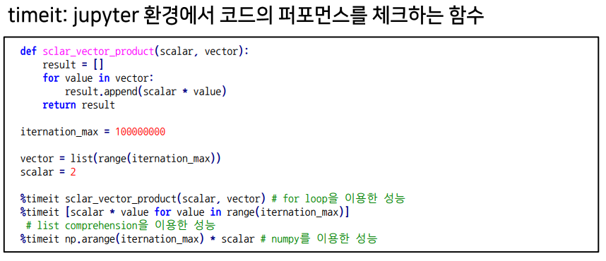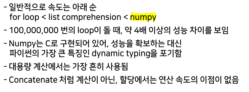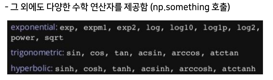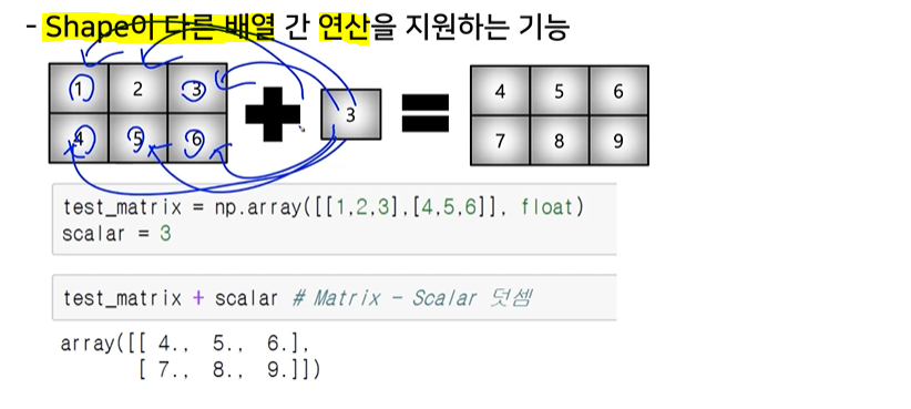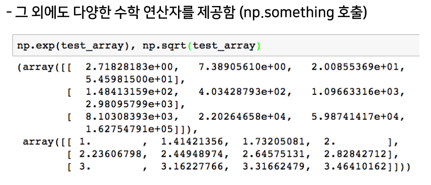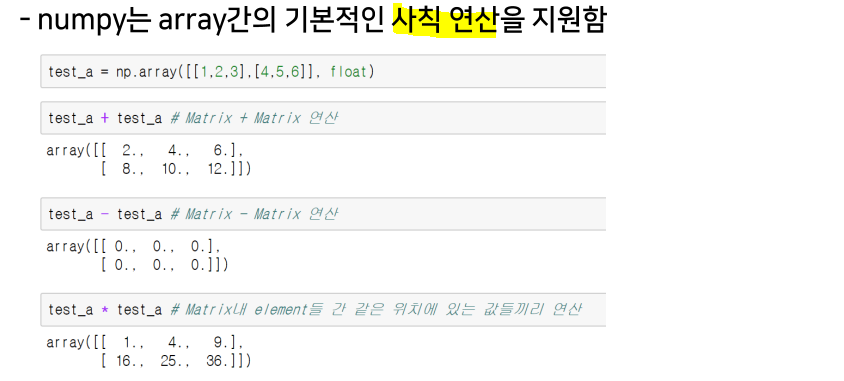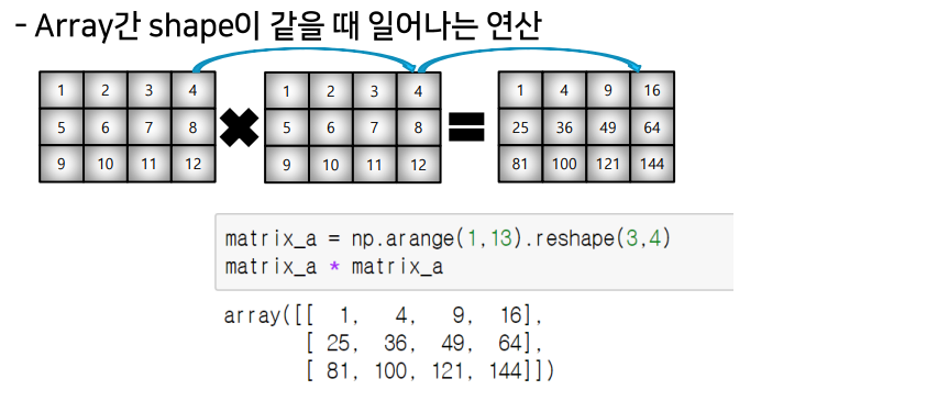 +, -, * : array간의 사칙 연산 지원element-wise operations : array간 shape이 같을 때 일어나는 연산.dot() : Matrix의 기본 연산.transpose() / .T : array의 축 바꾸기 (전치행렬)broadcasting : Shape이 다른 배열 간 연산 지원 기능 (Scalar-vector, vector-matrix)%timeit : jupyter환경에서 코드의 퍼포먼스 체크하는 함수Comparisons