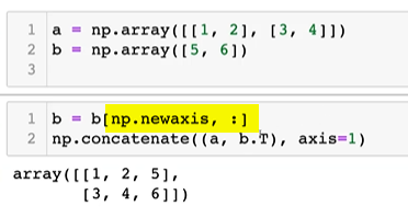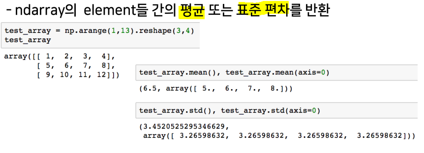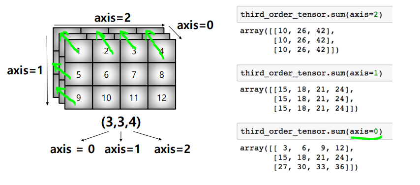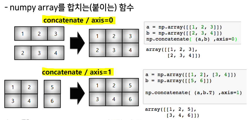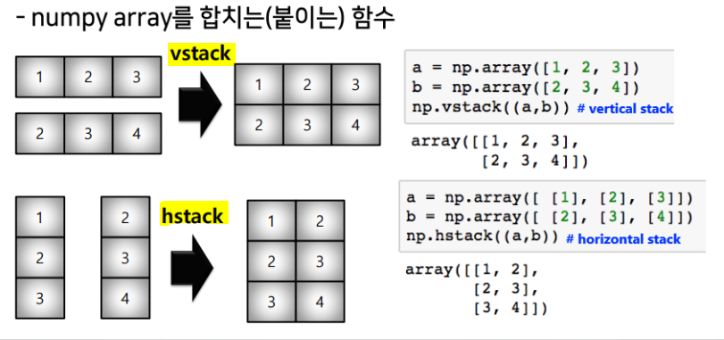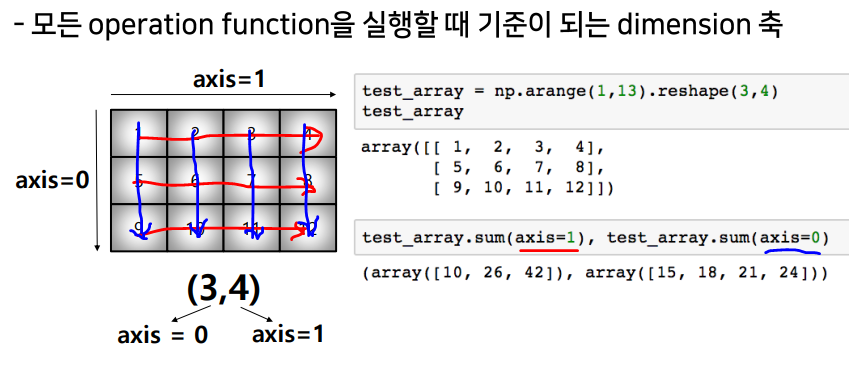 axis : 모든 operation function을 실행할 때 기준이 되는 dimension 축sum, mean, std : array의 합, 평균, 표준편차 연산vstack, hstack, concatenate : numpy array를 합치는(붙이는) 함수np.newaxis : array에 새로운 축 추가array operation