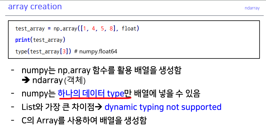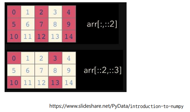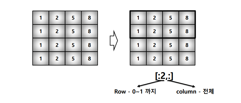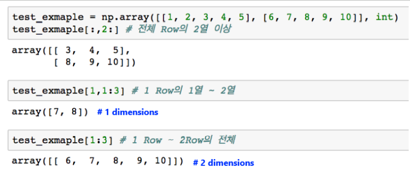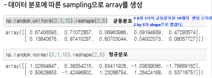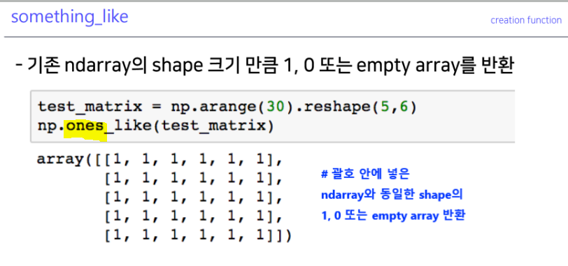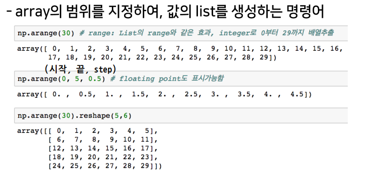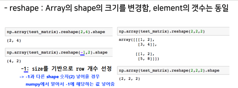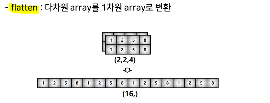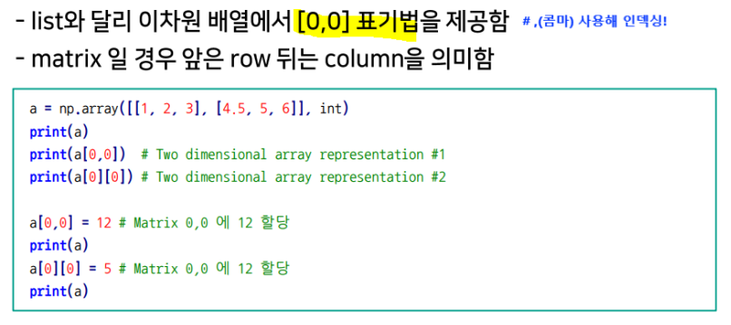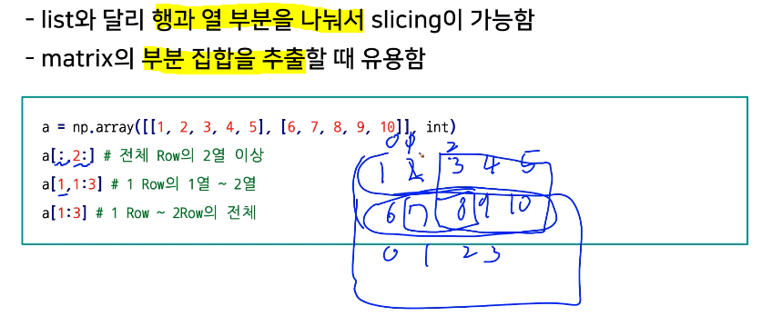 .reshape() : array shape 변경.flatten() : 다차원 -> 1차원indexing : [0,0] or [0][0]slicing : [row:column:step]Creation function