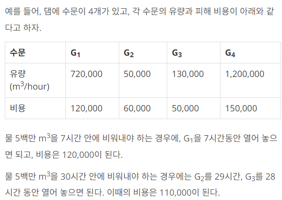 수문의 유량과 비용이 주어지면 일정시간 안에 목표 양을 비워야 한다.