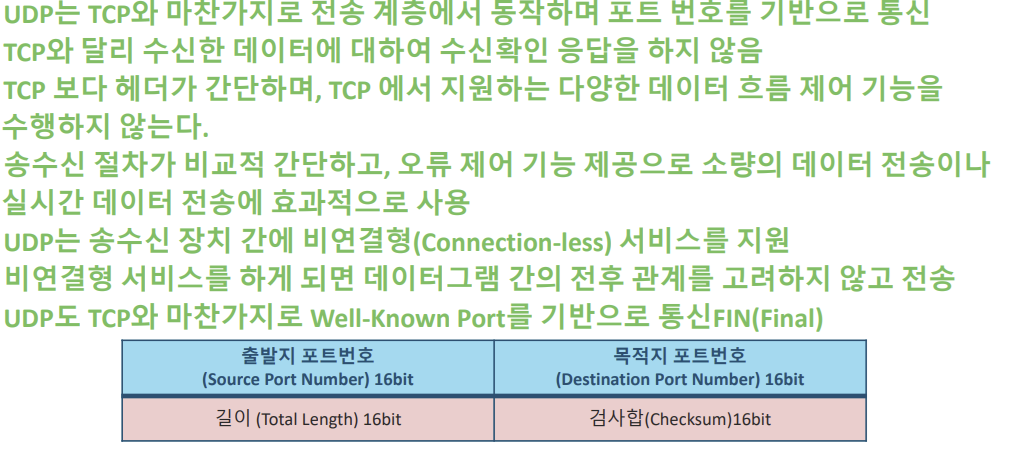 목적지 포트번호 : 목적지 호스트의 포트번호를 정의한 16비트 필드이며, Well-Know포트 번호사용