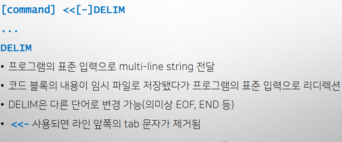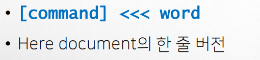 ex) cat > text <<< "한줄 짜리 내용" 이거보단 echo "내용" > text 가 편함