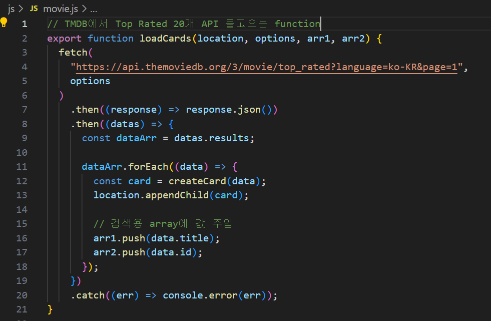 1) TMDB에서 Top Rated 영화 20개 정보를 fetch를 이용하여 API 들고오는 함수 사용