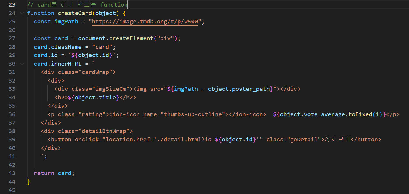 2) 영화카드 하나를 만드는 함수 - innerHTML을 이용하여 영화카드 하나에 들어가는 구성을 동적으로 만들어줌.