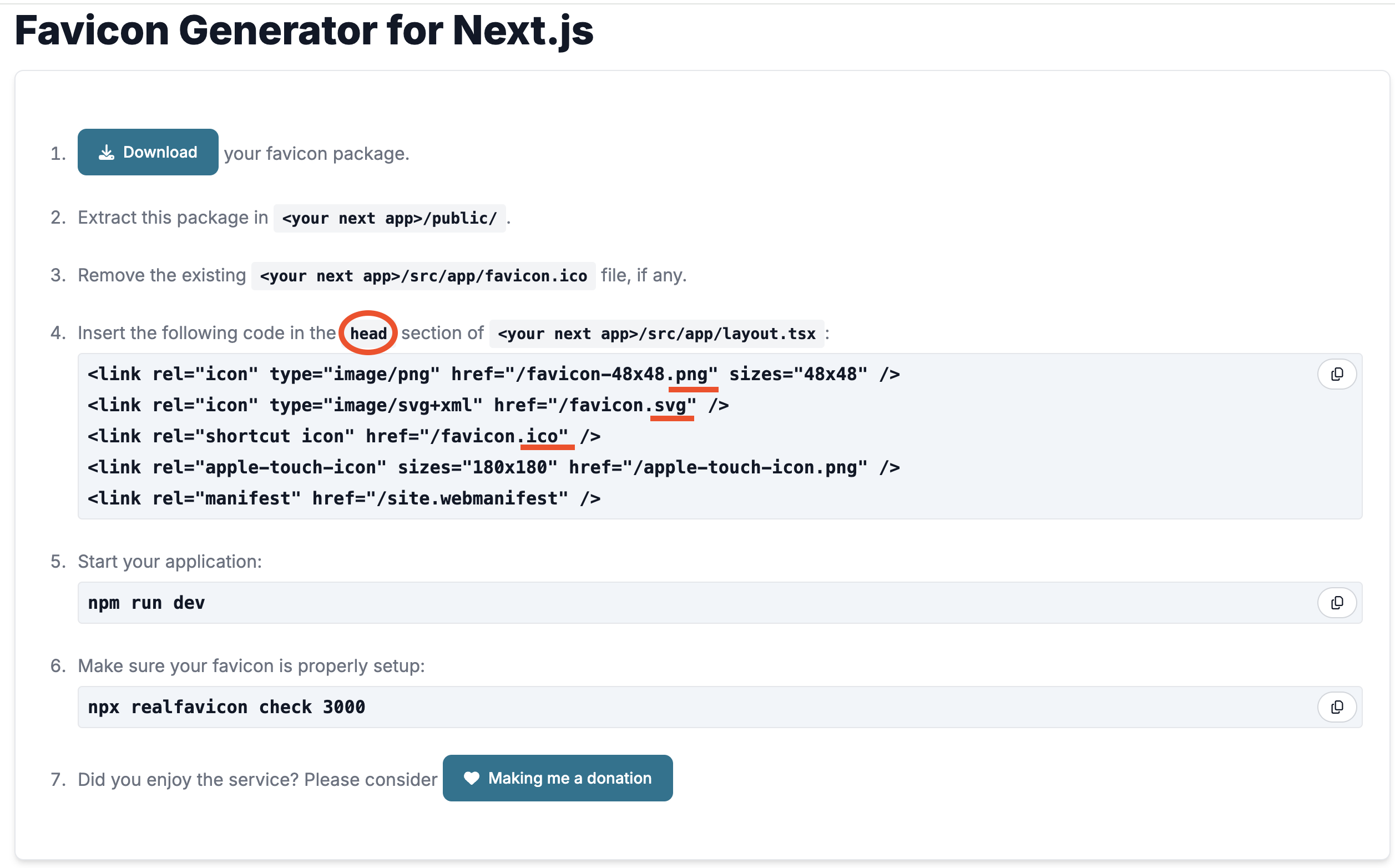 4번 내용에서 레이아웃 파일에서 <head>태그 안에 어떤 <Link>태그를 넣어야하는지 보여준다. 이미지 파일형식에 따라 다르니까 이걸 보고 그에 맞는 형식으로 입력한다.