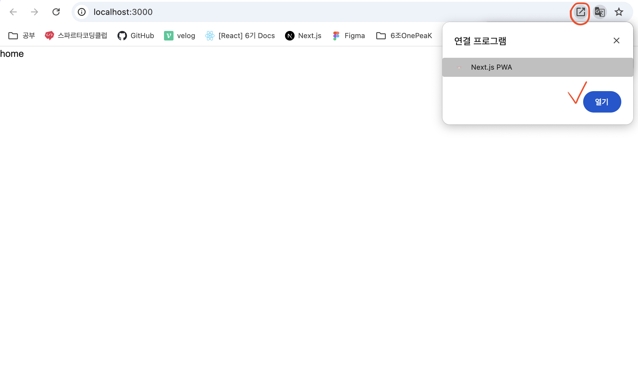 아래 사진처럼 빨간 동그라미 부분을 클릭하면 앱을 설치할 수 있는 아이콘이 url 표시줄에 보인다. 설치 후 '열기'를 클릭하면 웹앱에 접속 가능하고 잘 작동되는지 확인할 수 있다.