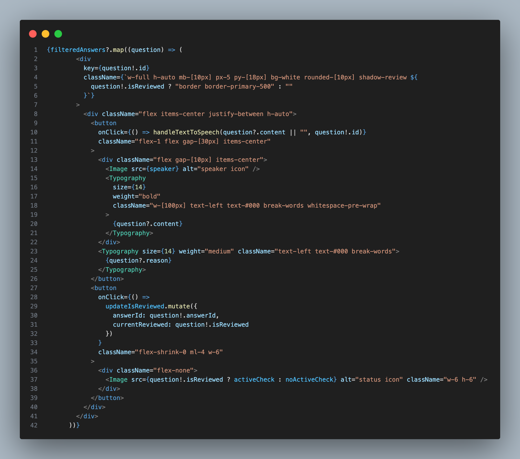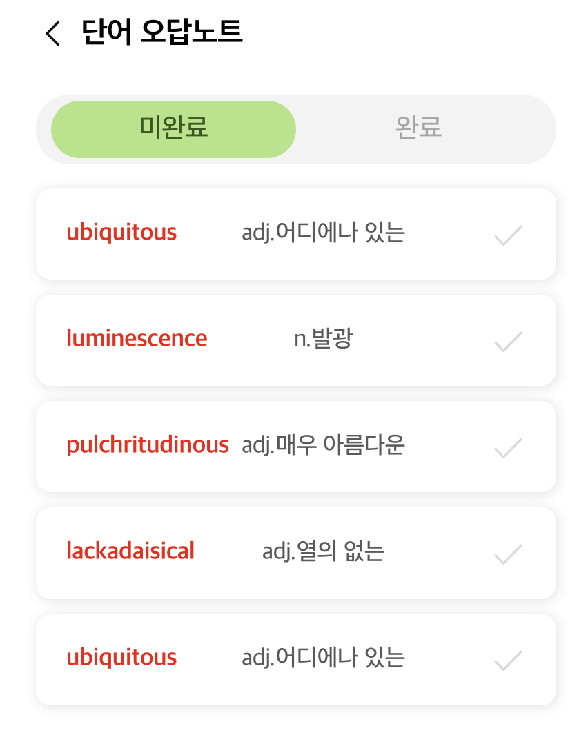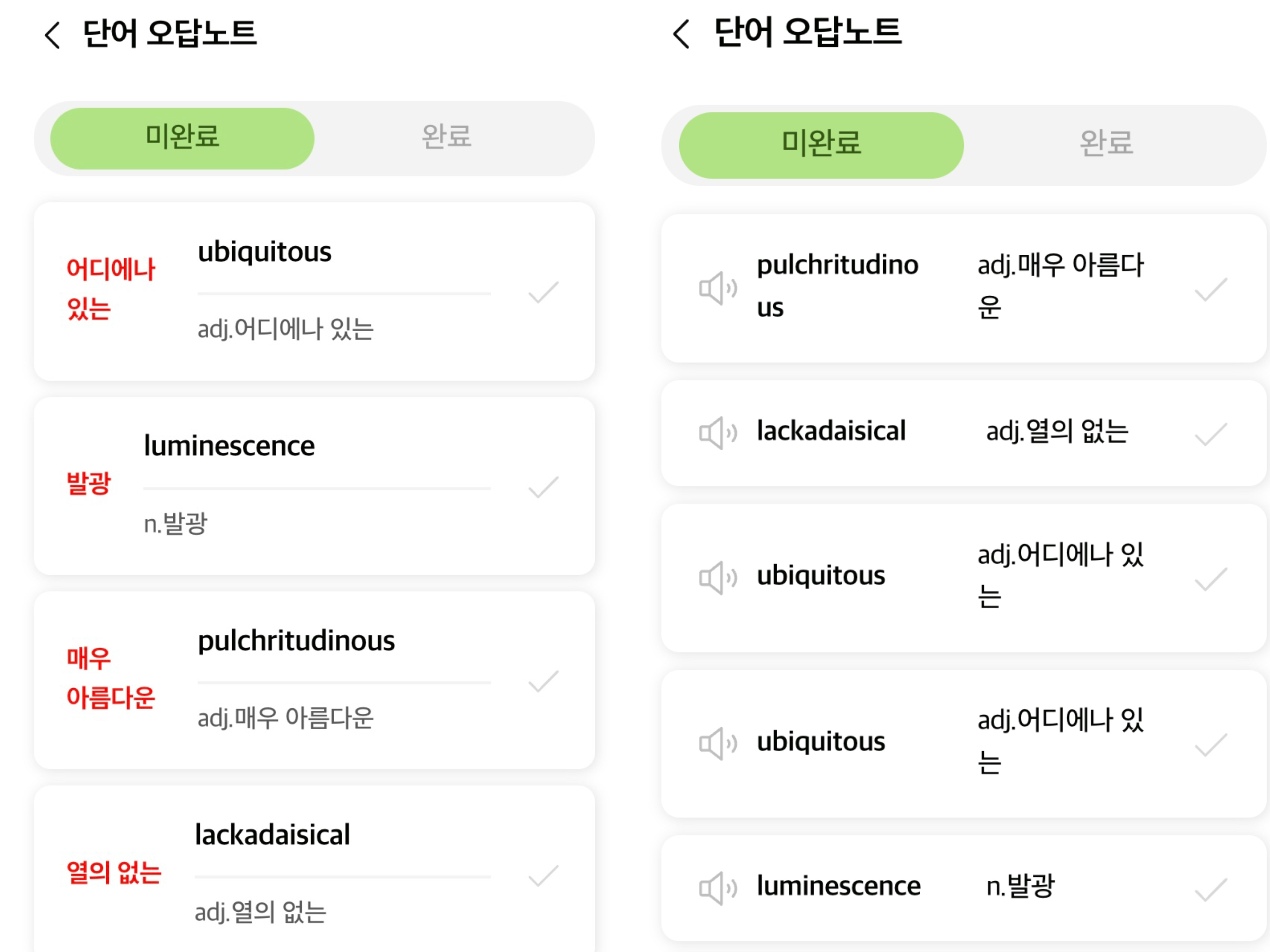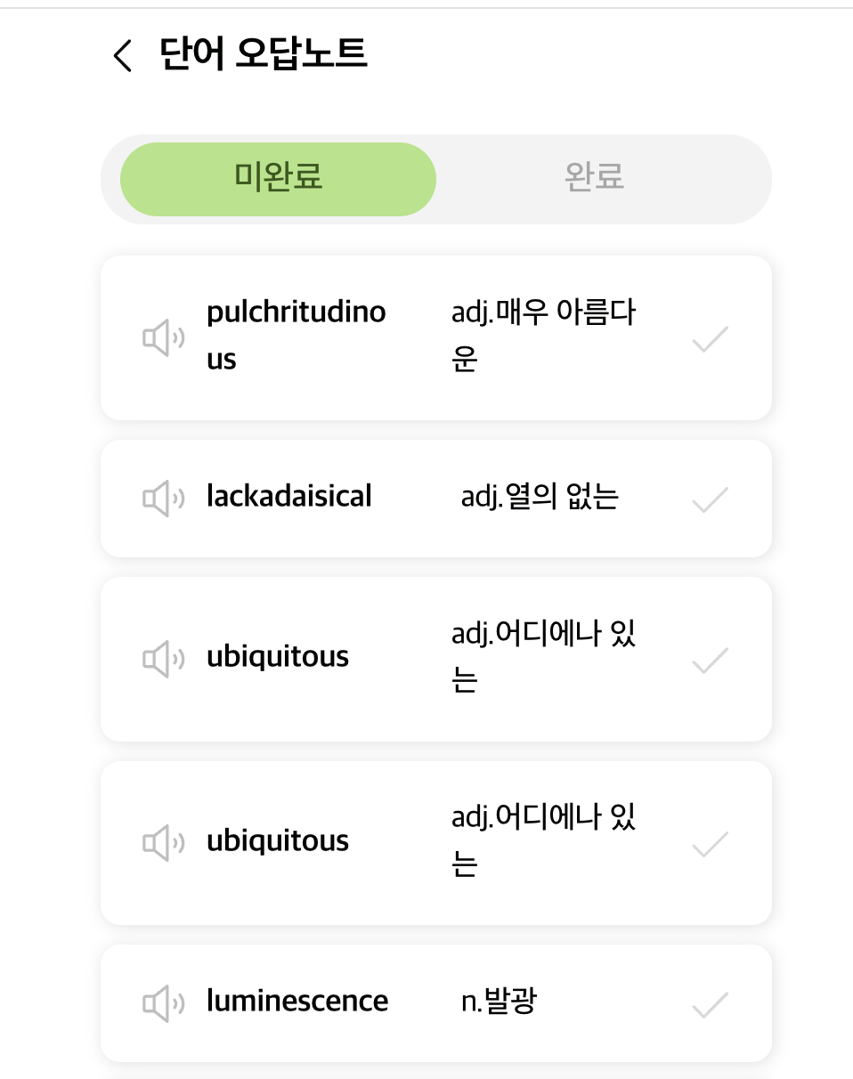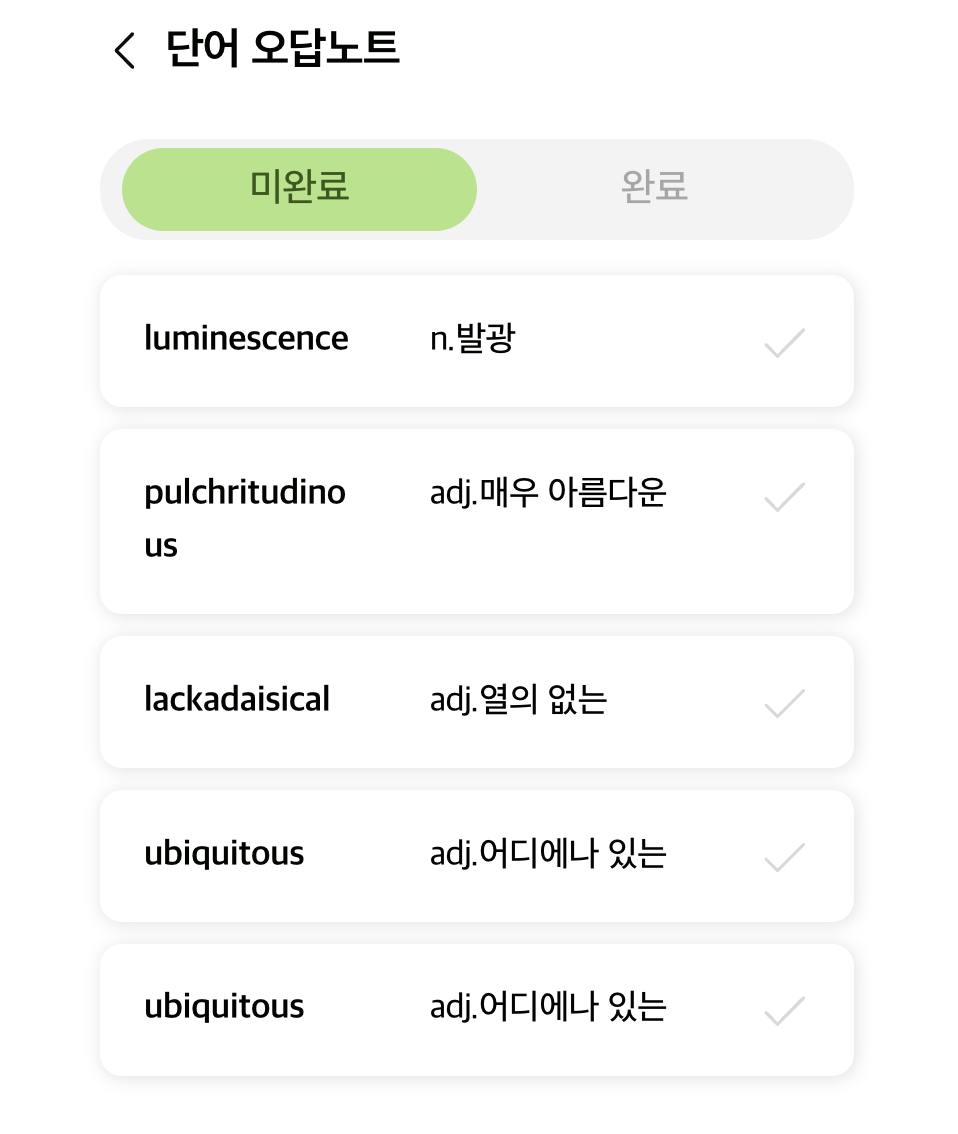 - 버튼의 범위를 하나의 단어 border가 있는 것이 아니라, 체크 이미지는 '완료/미완료'를 분류하기 위한 버튼, 나머지(스피커+단어+설명) 부분은 단어의 발음을 듣기 위한 버튼 태그로 구성했다.