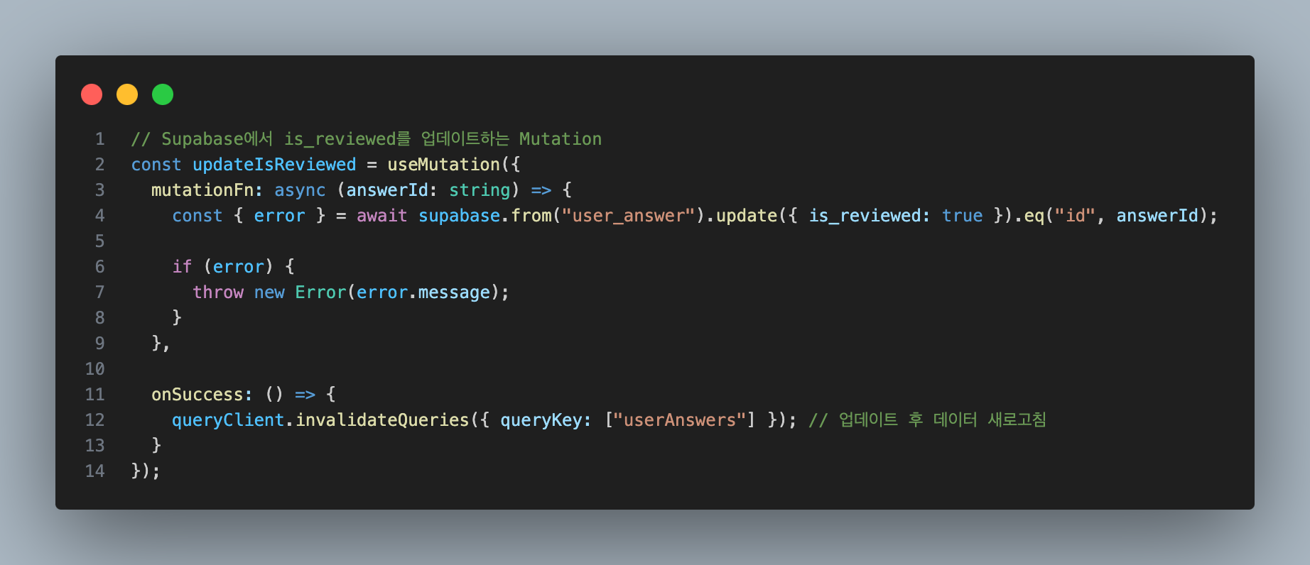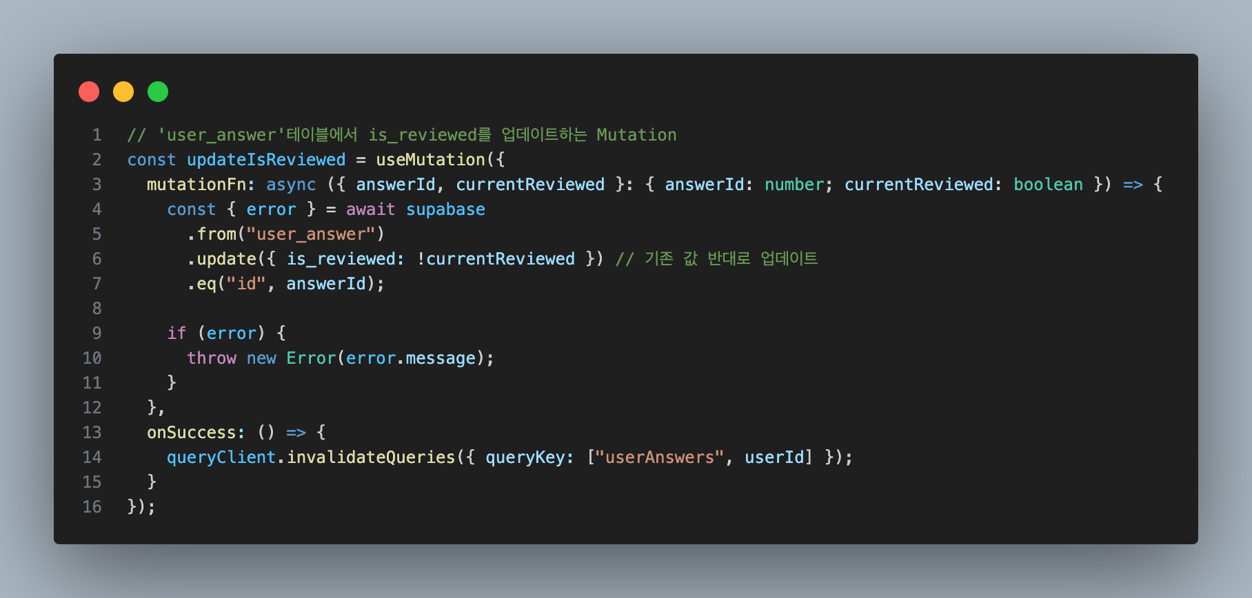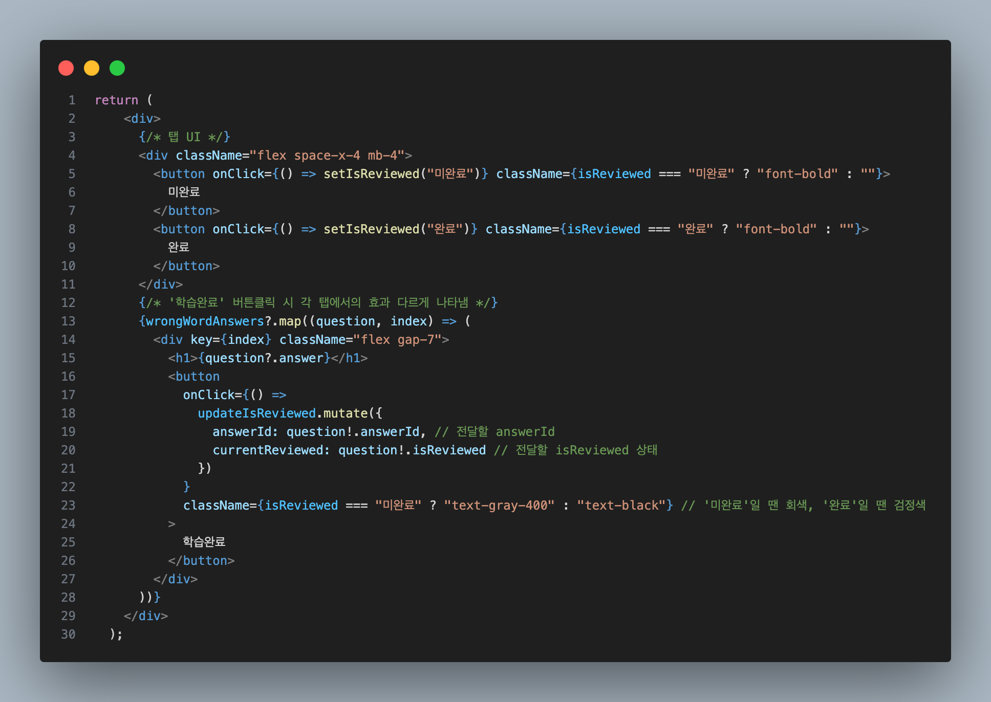 user_answer 테이블의 ‘is_reviewed’ 기본값이 false 인데, ‘학습완료(✔️)’ 버튼을 클릭하면 true로 업데이트!처음엔 디자인을 몰라 이렇게 코드를 작성했다.