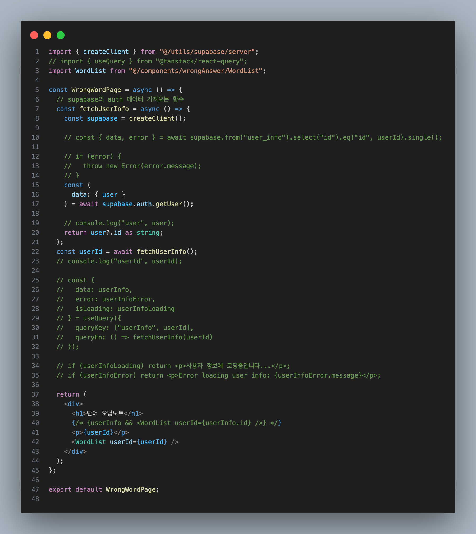 supabase.from(”user_info”)였으나, supabase.auth.getUser();로 변경함.