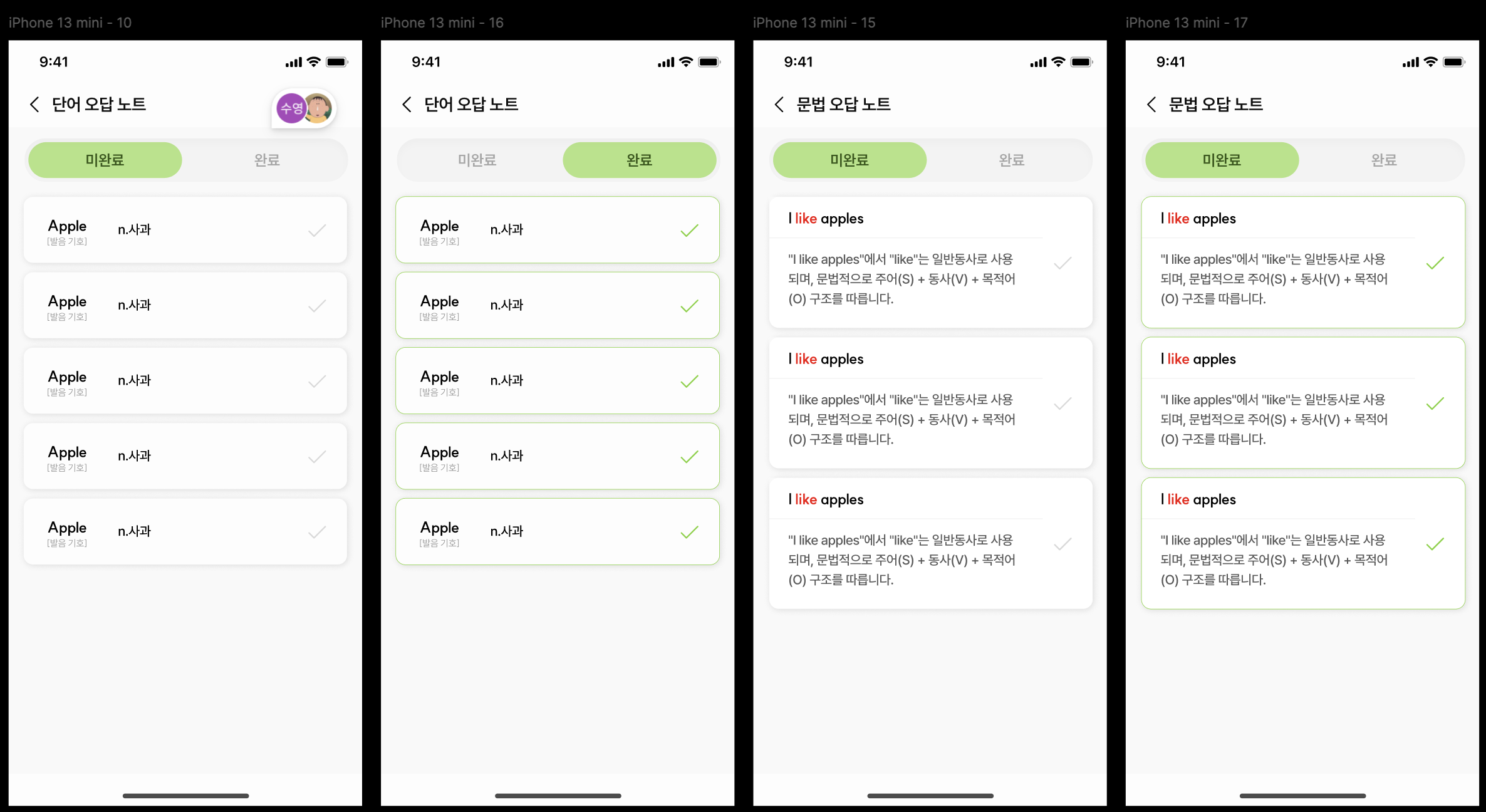 아래처럼 '미완료'탭에는 is_reviewed가 false인 리스트를, '완료'탭에는 is_reviewed가 true인 리스트를 보여주는데, 틀린 단어나 문법 오른쪽에 '학습완료 또는 체크'버튼을 클릭하면 변경되게 변경하였다.