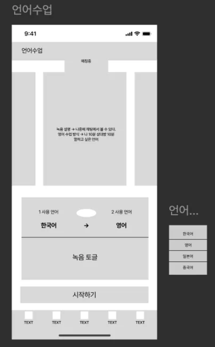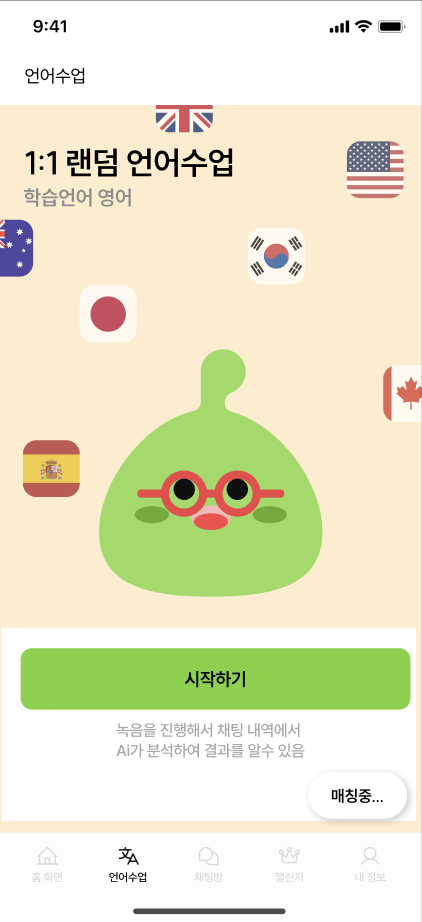 4) '시작하기' 버튼을 누르면 언어와 녹음 동의 여부에 따라 매칭이 진행되는 방식이었다.