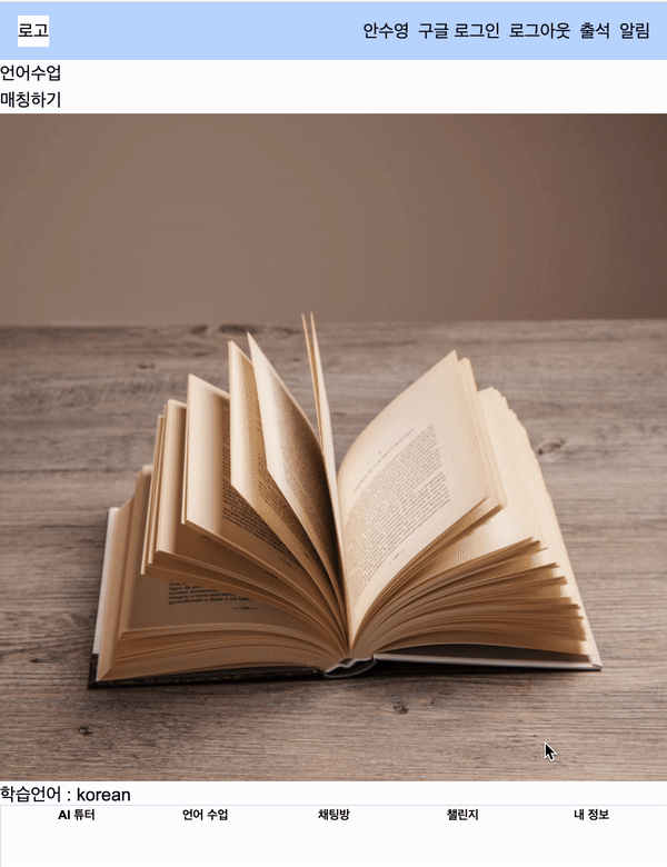 user_info 테이블에서 learn_language 데이터 불러와서 보여주기다른 팀원분께서 매칭을 위한 훅을 만들어 두셔서, 이미 userInfo 데이터가 불러와져있어, UI부분에서 {userInfo?.learn_language}만 적어주었다.