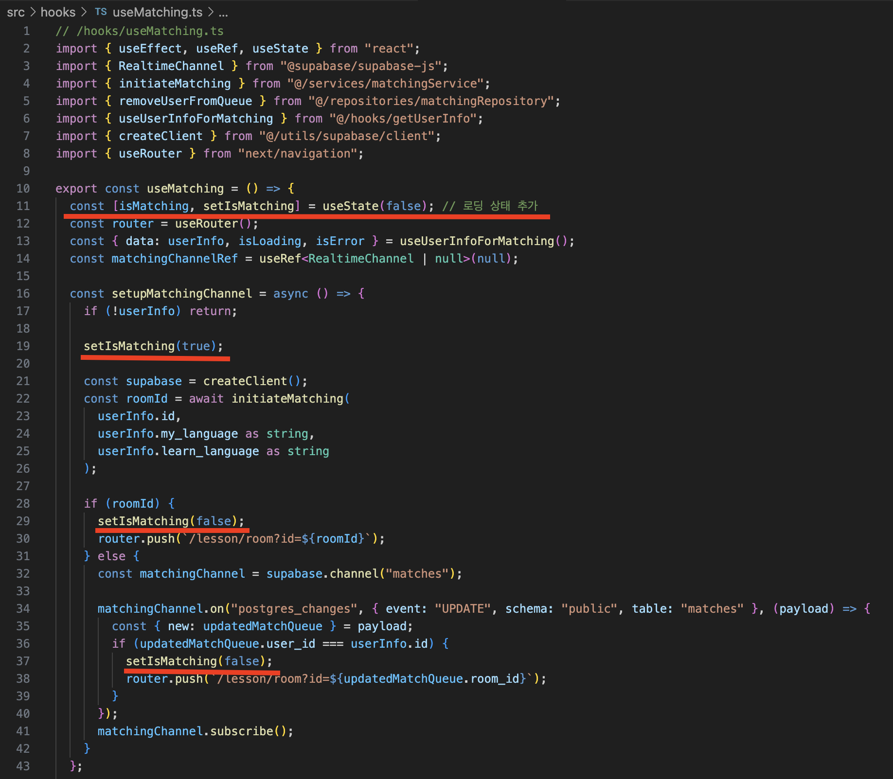 다른 분께서 만들어둔 useMatching 훅에서 로딩상태를 담는 useState를 추가하여
