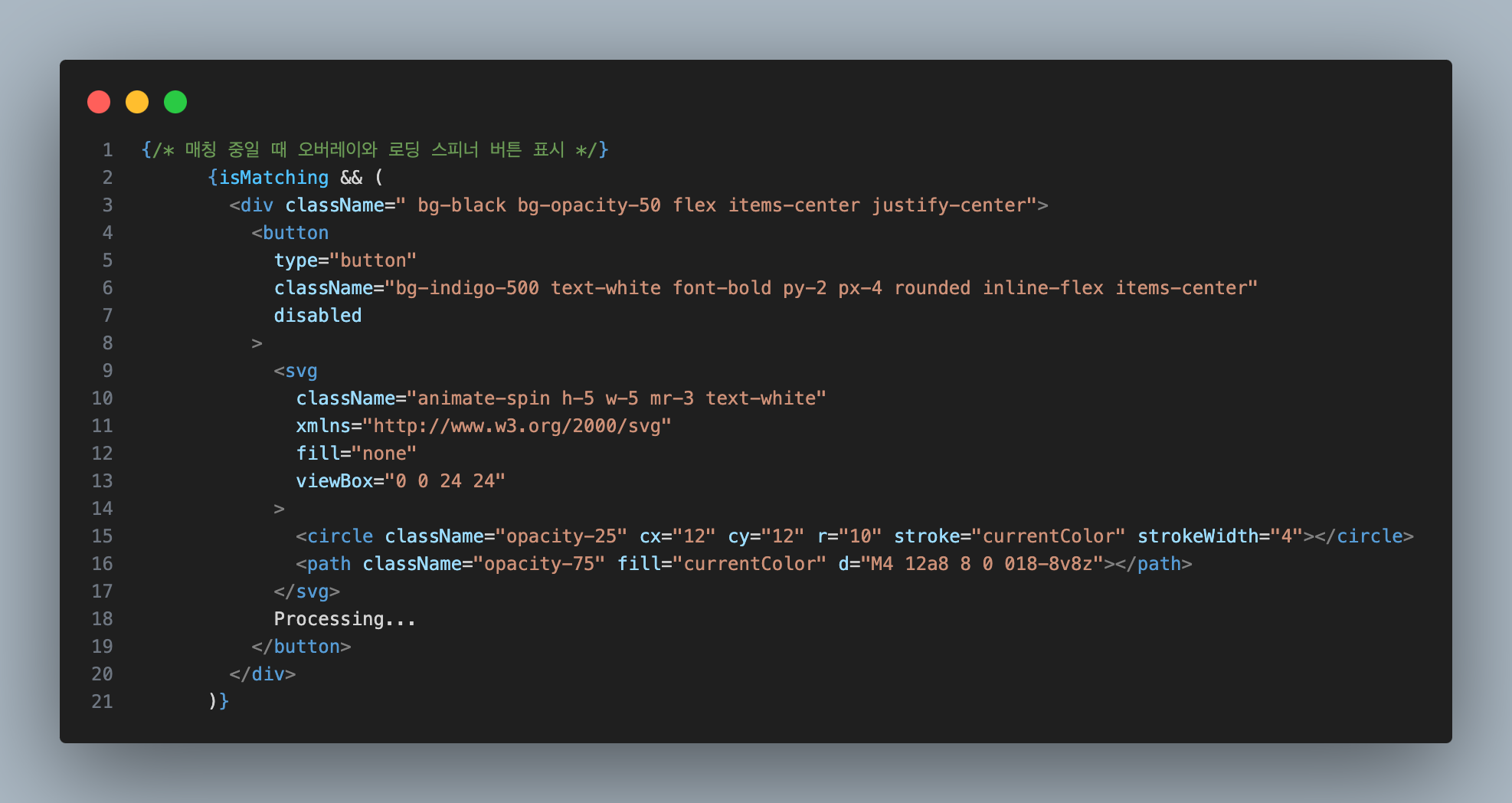 언어수업 첫 페이지에서 useMatching 훅을 가져올 때, 로딩상태를 담는 isMatching도 같이 props로 넘겨주어 매칭 중일 때 로딩스피너를 보여주는 UI코드를 작성했다.