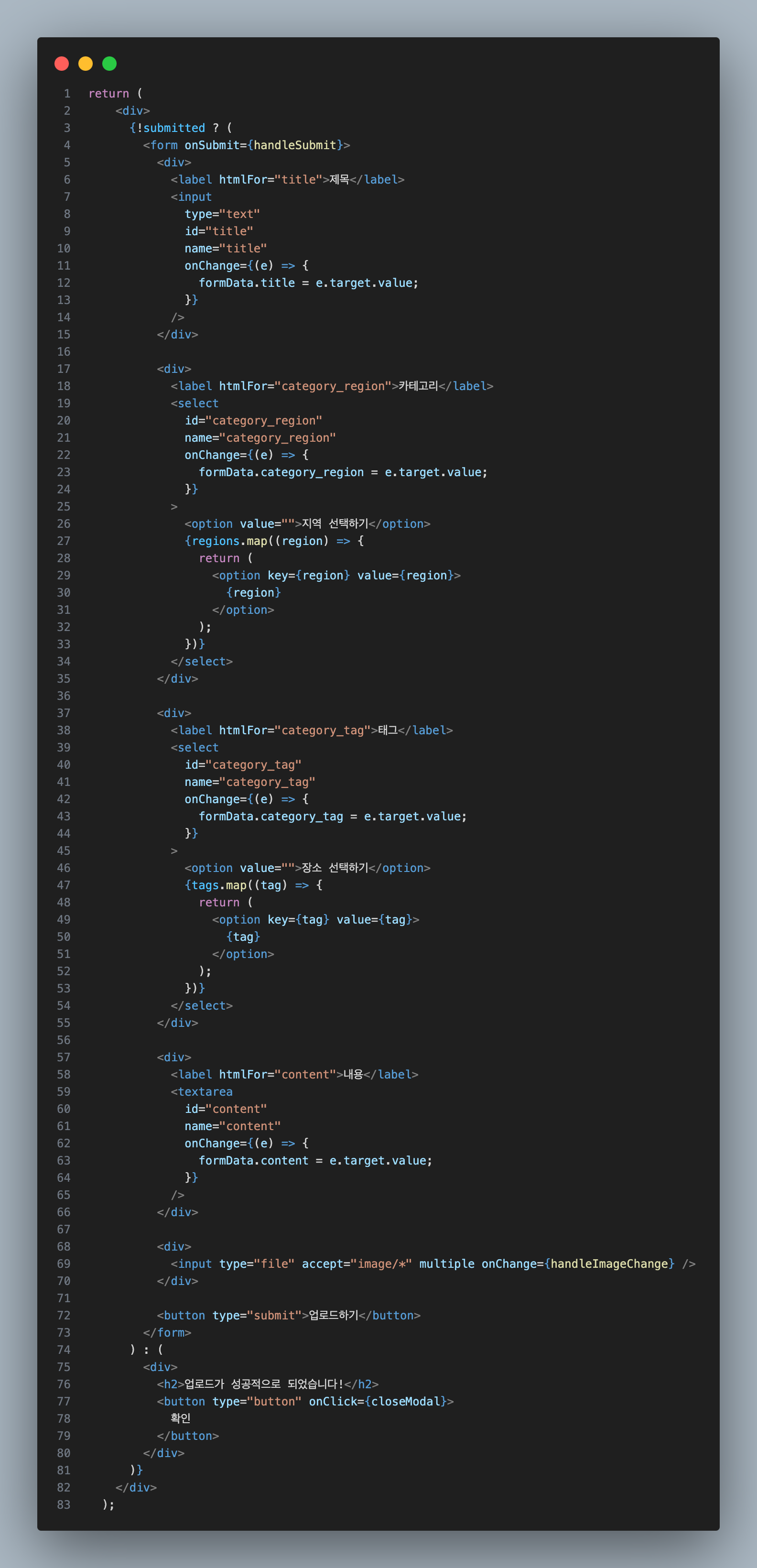 제목 / 카테고리 - 지역 선택 / 태그 - 장소 선택 / 내용 / 이미지