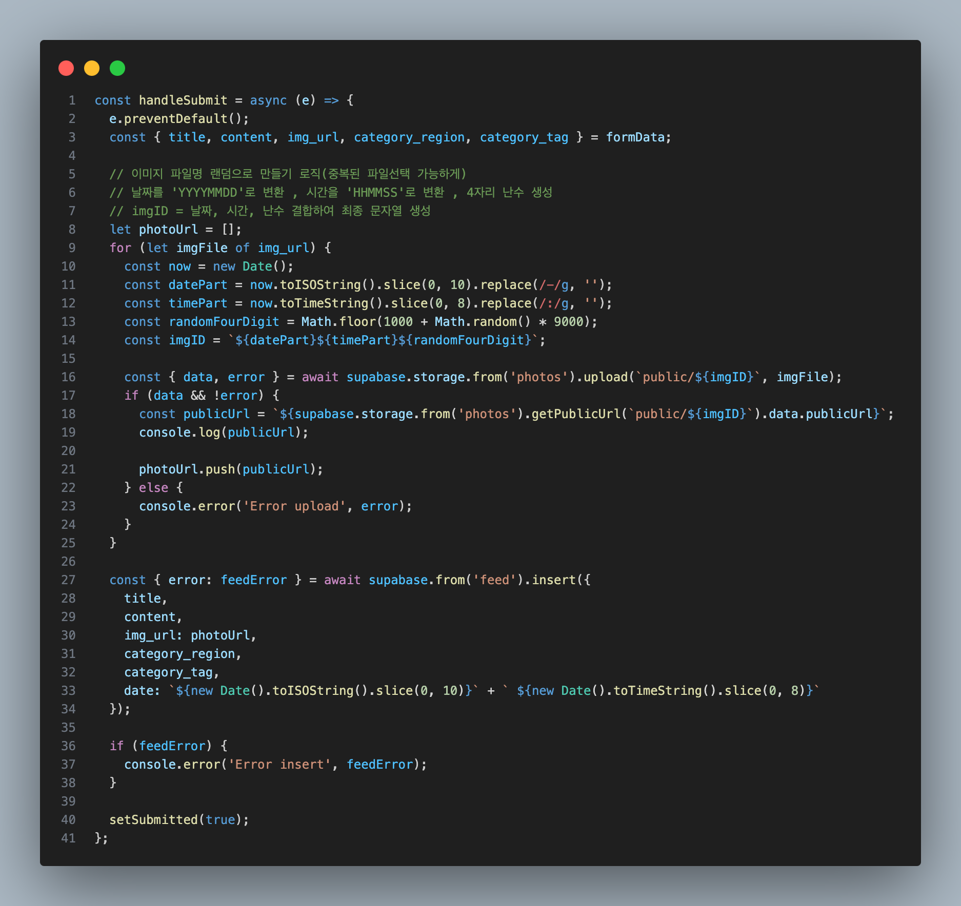 이 모달에서게시물을 작성하고, 업로드 버튼을 누르면 메인페이지 피드에 보여질 수 있도록 supabase에 데이터를 보내는 부분
