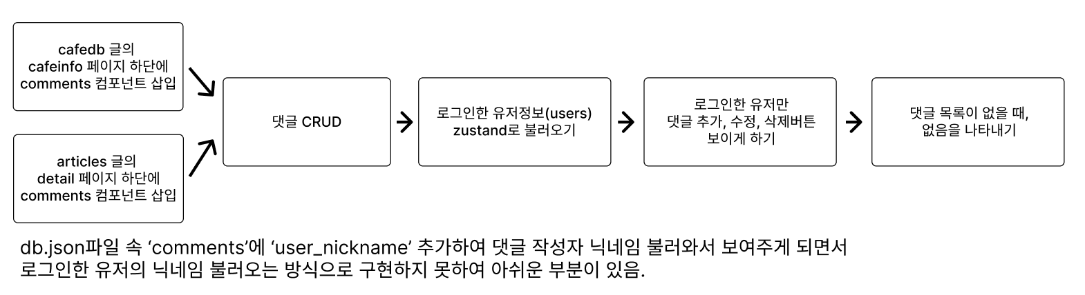 작성자 닉네임을 불러오는 과정에서 comments와 zustand로 불러온 로그인한 users 내용을 이용하여 닉네임을 불러와야 프로필 닉네임 변경 시 반영이 되는데, comments에 닉네임 값을 추가하면서 닉네임 변경 시 반영되지 않는 부분에서 어려움을 많이 겪었습니다.