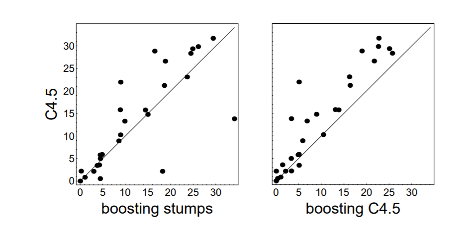 y 축은 C4.5 모델만 사용한 것이고, x 축은 stump나 C4.5 모델을 부스팅한 결과입니다. 정확도를 scatter plot으로 나타낸 것이기 때문에, 부스팅을 사용하였을 때, 대부분의 경우에 C4.5보다 좋은 성능을 보이는 것을 알 수 있습니다.