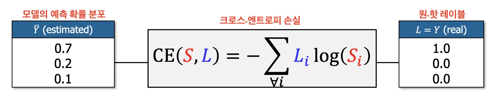 L (real): 실제 레이블을 원-핫(one-hot) 인코딩한 벡터