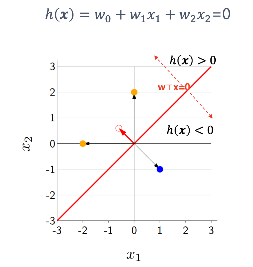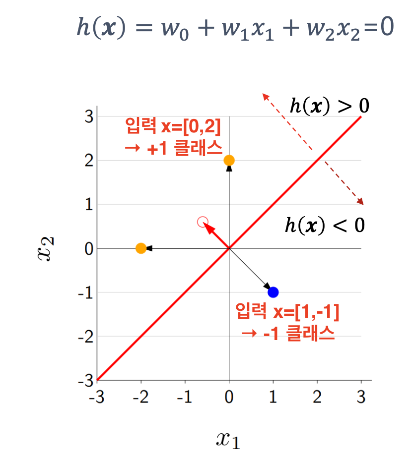선 아래 영역: wTx<0 ⇒ 예측값 -1