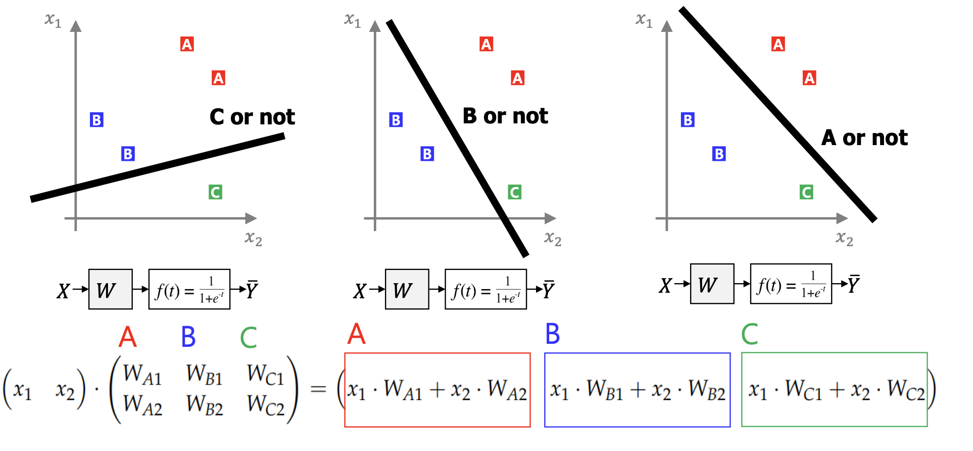 입력 벡터 x에 대해, 클래스 A,B,C 각각의 가중치 벡터를 내적해