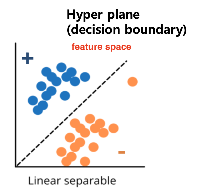 선형 분류기는 결정 경계(decision boundary)를 Hyperplane으로 결정