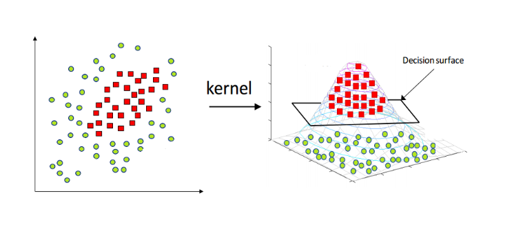 고차원 공간에서는 선형 분리가 가능하도록 만들어줌