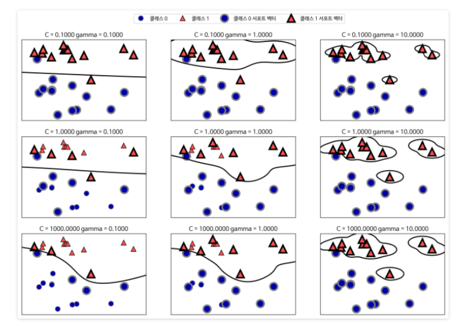 γ : RBF의 폭. 값이 클수록 '좁고 날카로운' 가우시안 곡선