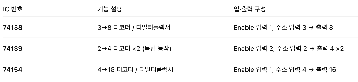 입력 이진 코드(예: 3비트)를 받아, 대응하는 출력만 1로 활성화