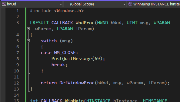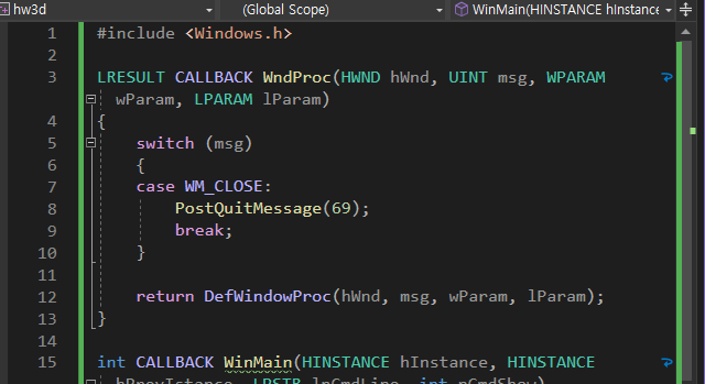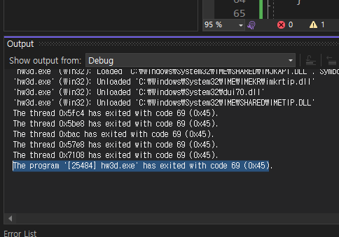 PostQuitMessage(69)이 제대로 동작하는지 확인을 하는 작업이다.