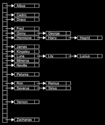 여러 값들을 몇 개의 바구니에 나눠 담는 상황을 생각해보자. 강의에서는 강의장 단상 위에 A부터 Z까지 라벨링한 바구니 26개를 일렬로 늘어트려 놓고, 해리포터 출연진들의 이름표를 넣는 상황을 연출했었다.