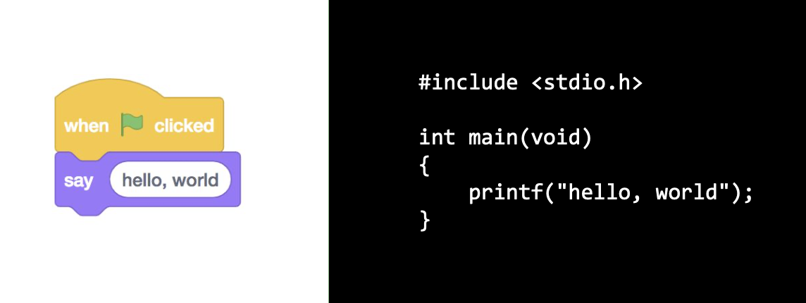 int main(void) : 프로그램의 시작점{} : 우리가 작성할 코드는 모두 이 안에 넣는다printf("") : 스크래치에서의 say라는 함수는 없고, 화면에 문자를 보여주는 역할을 하는 출력함수가 있다. 언제나 텍스트는 쌍따옴표로 감싸야 한다. 그리고 문장에 마침표를 찍듯이 세미콜론을 붙여야 한다.\n : 줄바꿈 기능#incldue<stdio.h> : stdio.h라는 파일 안에 미리 작성된 함수들에 접근할 수 있도록 한다. 파일이름.c : c로 작성할 코드를 저장할 때 수동으로 확장자를 붙여줘야 한다.