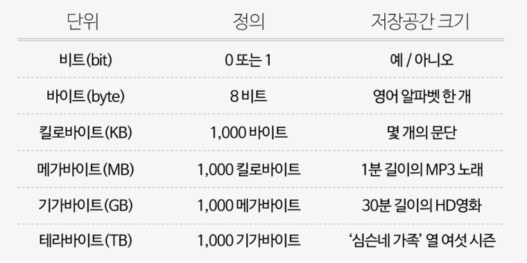 컴퓨터는 0과 1로 숫자 뿐만 아니라 글자, 사진, 영상, 소리 등을 저장할 수 있다. 어떻게 이것이 가능할까?