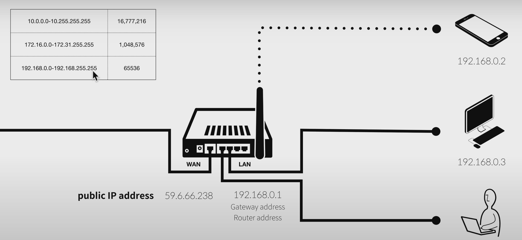 공유기를 중심으로 지역네트워크가 생성된다. 동시에 공유기는 전세계 가장 거대한 네트워크인 인터넷(광역 네트워크)에 소속되어 있다. 공유기는 WAN와 LAN 두 개의 네트워크 사이에 있는 교환원 같은 기계
