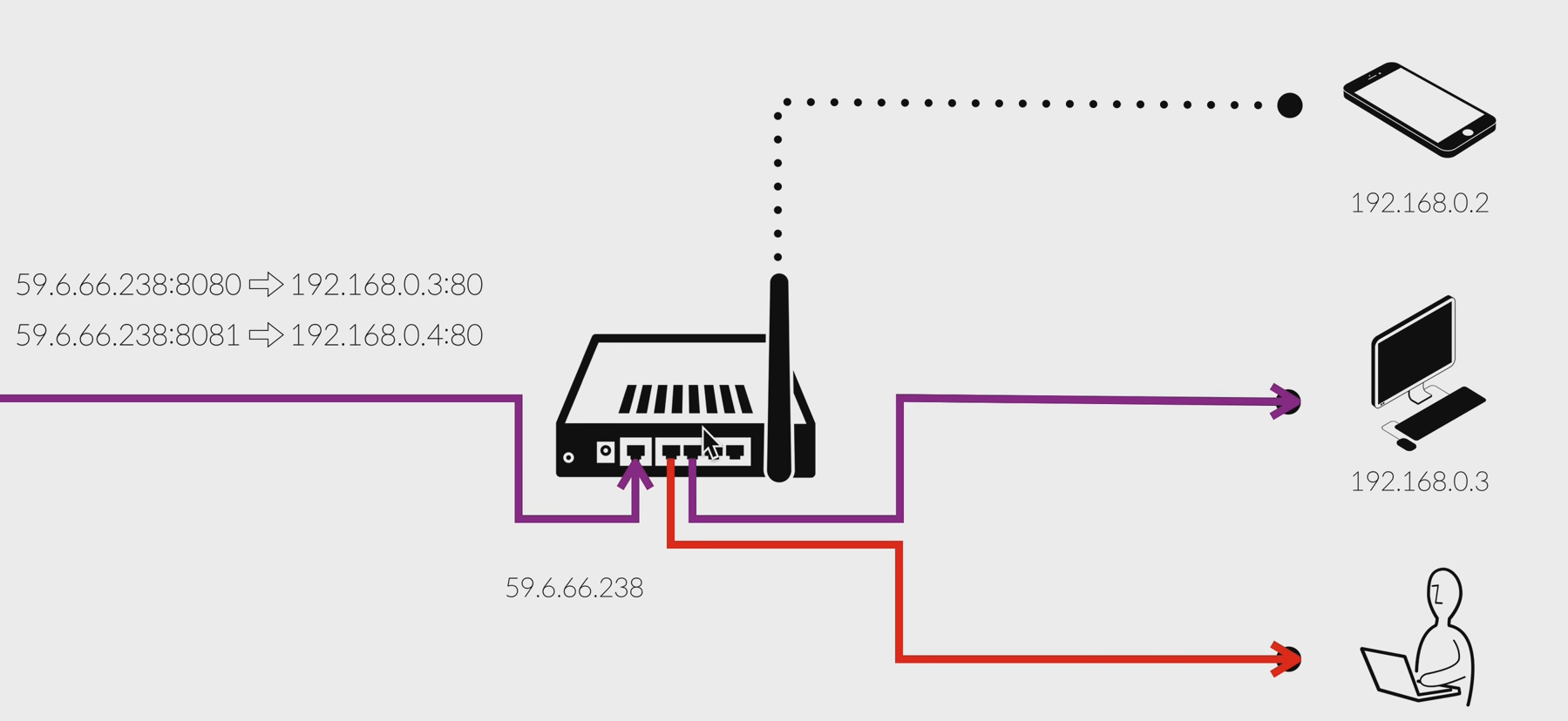 라우터로 들어온 포트번호가 무엇이냐에 따라서 내부 네트워크에 있는 특정 머신의 특정 포트로 포워딩