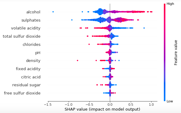 Summary plot은 모든 피처의 SHAP value를 한 번에 보여준다. 피처의 중요도는 그래프에서 위에서 아래로 정렬되며, 각 피처의 SHAP value의 분포는 수평선으로 표시된다.