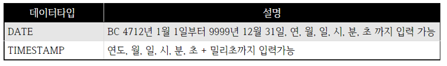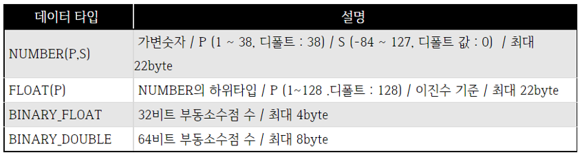 - NUMBER는 가변숫자 길이이므로 P,S를 입력하지 않으면 저장 데이터의 크기에 맞게 자동 조절된다.