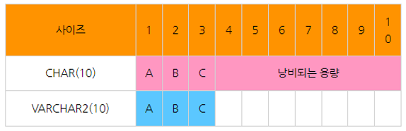 ※ 위 사진에서 char는 고정길이 , varchar2는 가변길이 이다.