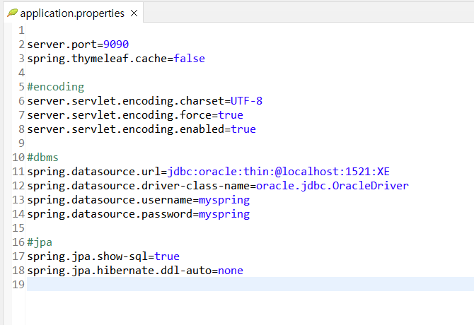 appilcation.properties에선 위 사진과 같이 server port 설정, servlet encoding , dbms 환경 , jpa 설정 등 여러가지 configuration을 할 수 있다.