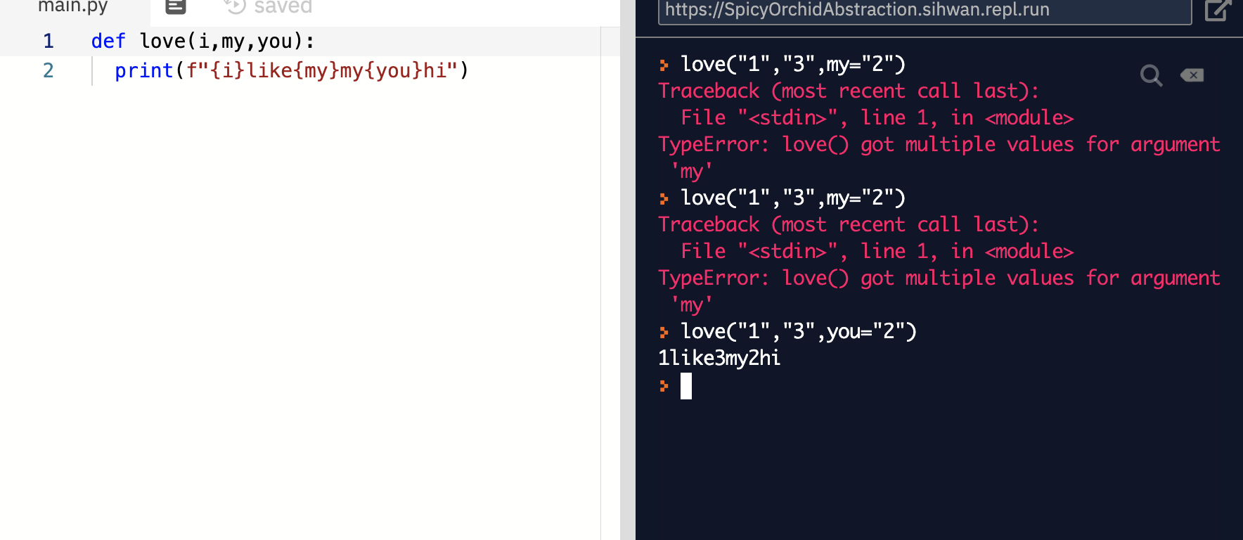 순서를 맞추어서 parameter값을 전해주는 positional arguments와 keyword arguments를 혼용해서 사용가능.