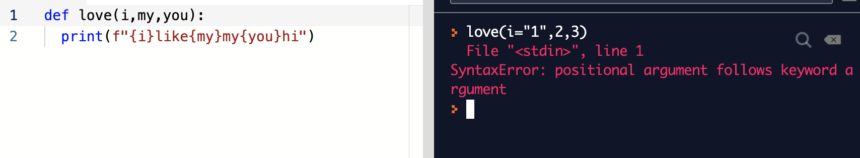 keyword argument는 parameter이름으로 맞추어서 값을 전해주기 때문에 자신의 위치를 알고 들어가지만, 명시되어 있지 않은 상태의 positional argument는 순서를 지켜줘야한다.