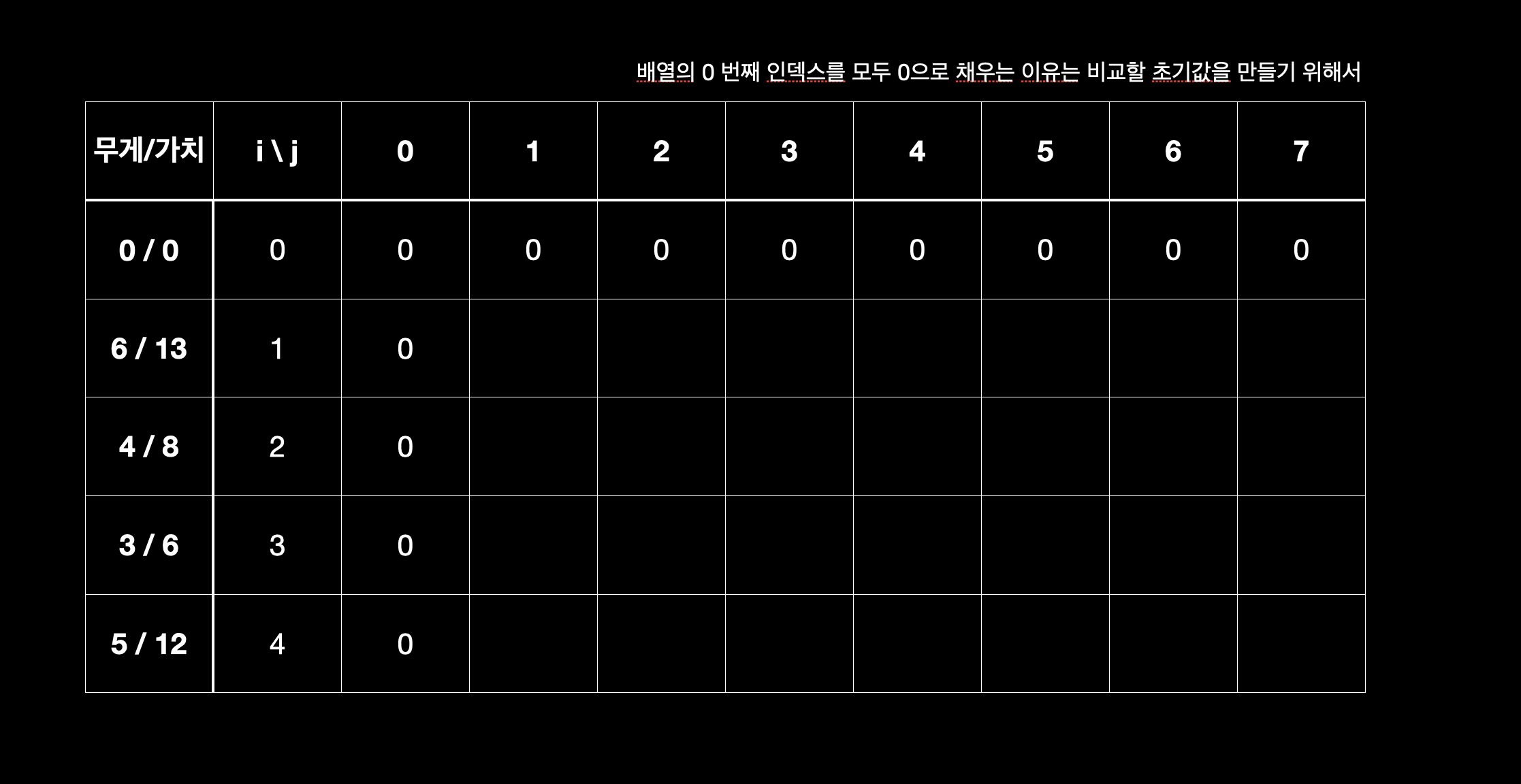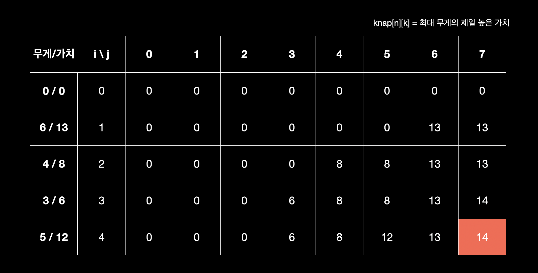 - j < weight 시 knap[i][j] = knap[i-1][j]