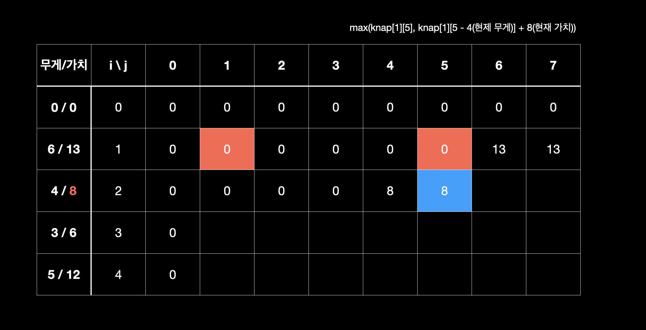 knap[1][4+1] = max( knap[1][5], knap[2-1][ 5 - 4 ] + 8 ) )