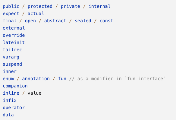 코틀린의 클래스, 함수, 변수, 프로퍼티, 생성자 등에는 앞에 부과적인 의미를 부여하는 키워드가 존재합니다.