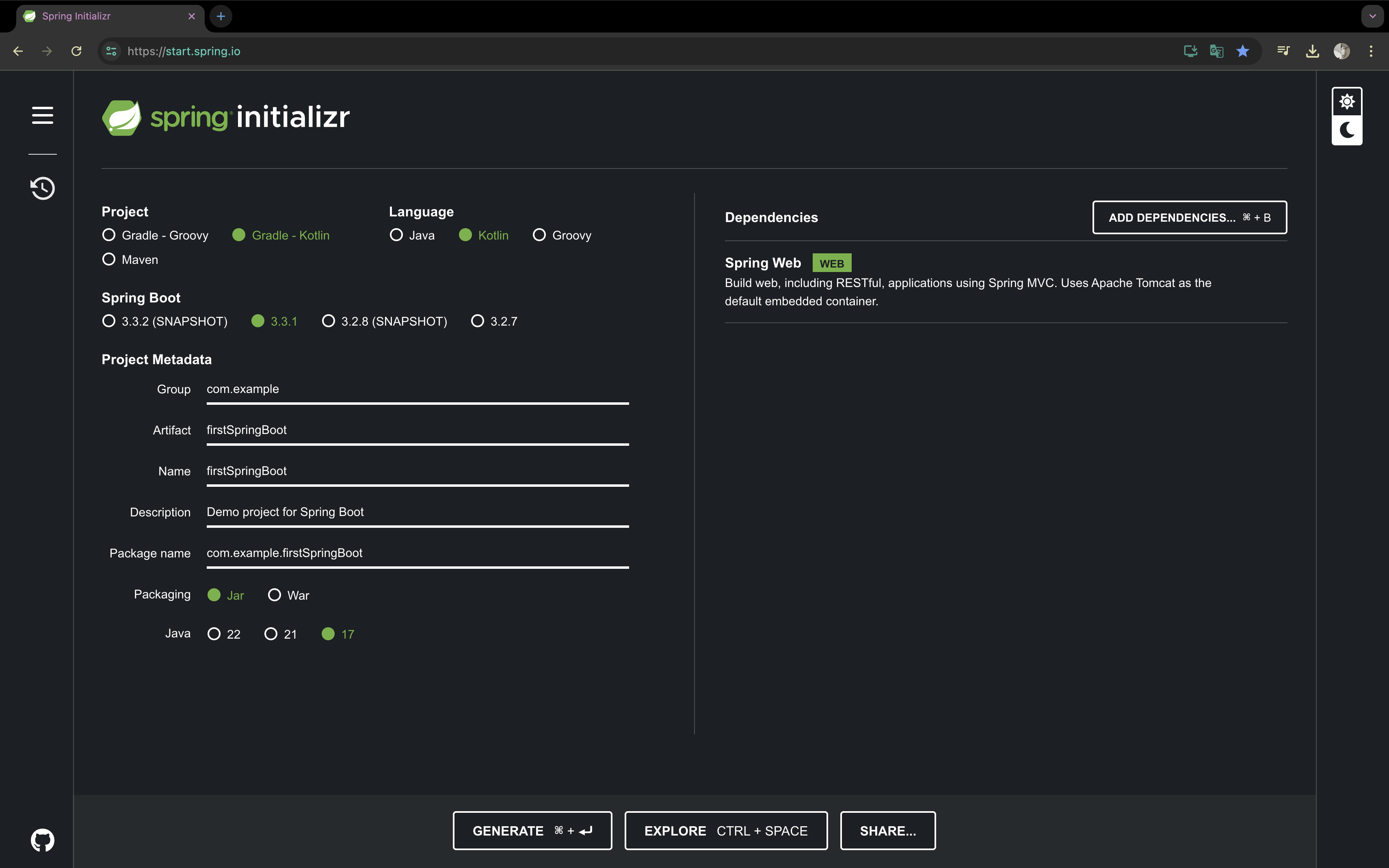 의존성 추가는 기본적으로 RestAPI를 위해 Spring Web을 추가했으며