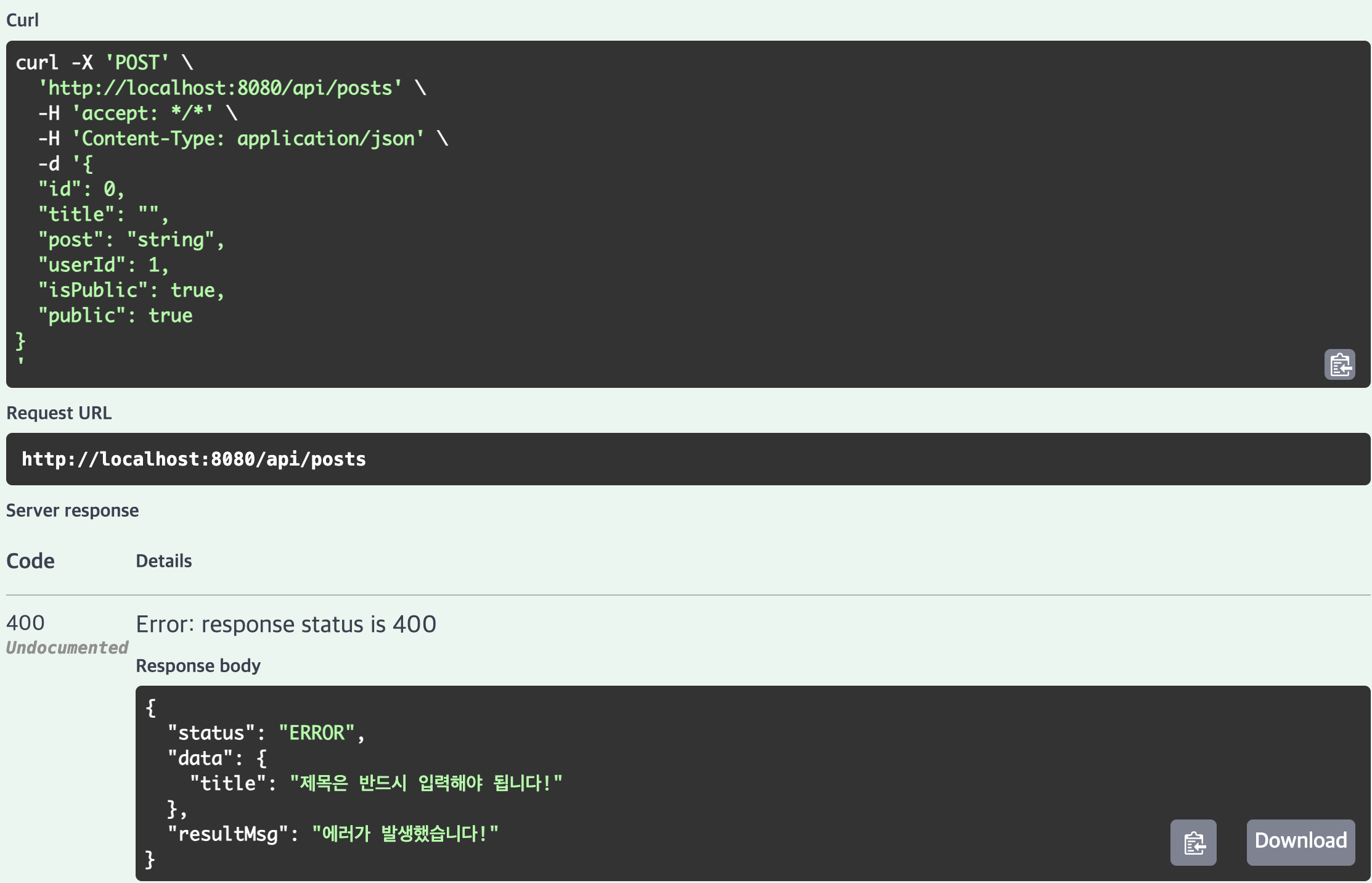 예를 들어 제목이 비어도 API는 성공을 반환하고 데이터베이스에 공백 그대로 저장되게 됩니다.