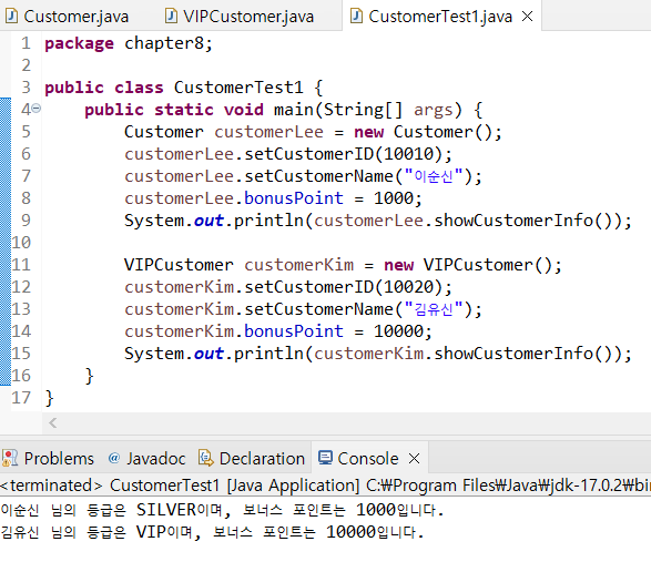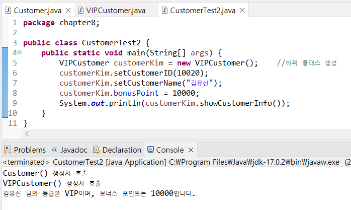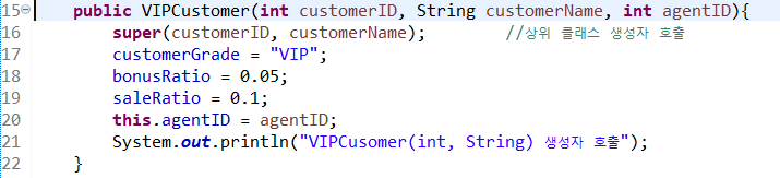 -> 호출될 디폴트 생성자 Customer()가 위에서 삭제됐기 때문에 다시 명시적으로 상위 클래스 생성자를 호출함.